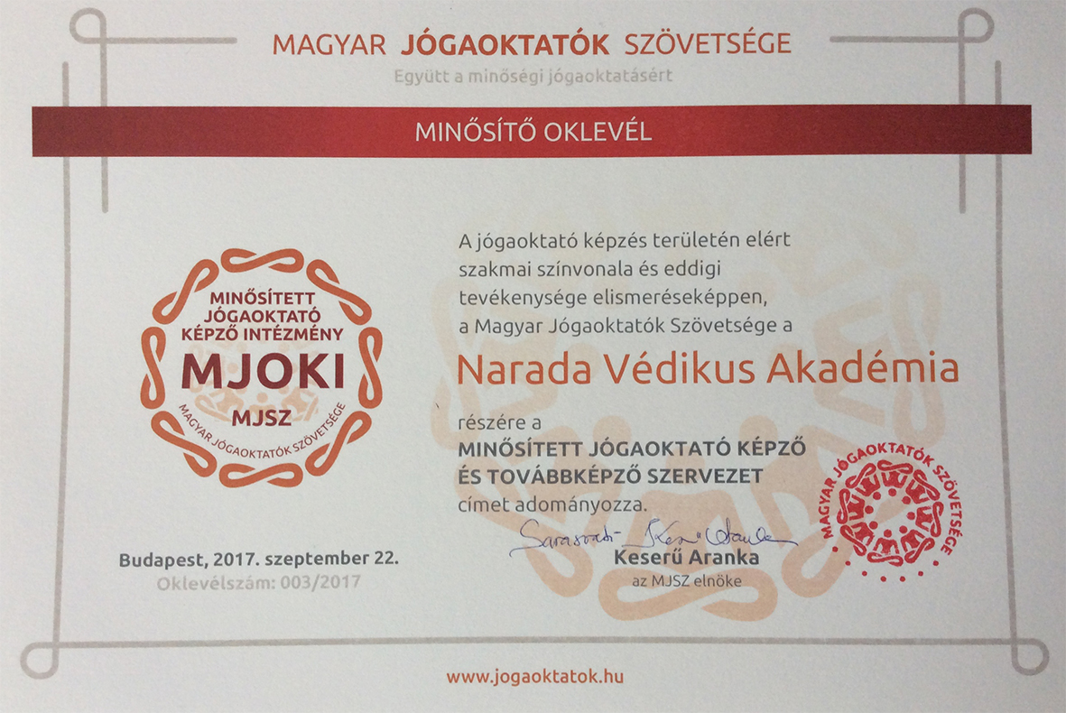A Narada Védikus Akadémia vonatkozó hazai jóga oktató képzés minősítése az MJSZE-nél: